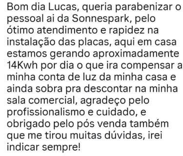 Desde então, a SonneSpark vem crescendo rapidamente, prestando serviços especializados para outras empresas do setor solar, acumulando experiência em ritmo acelerado e se destacando pela qualidade e comprometimento no pós-venda — um diferencial que muitas empresas não oferecem.